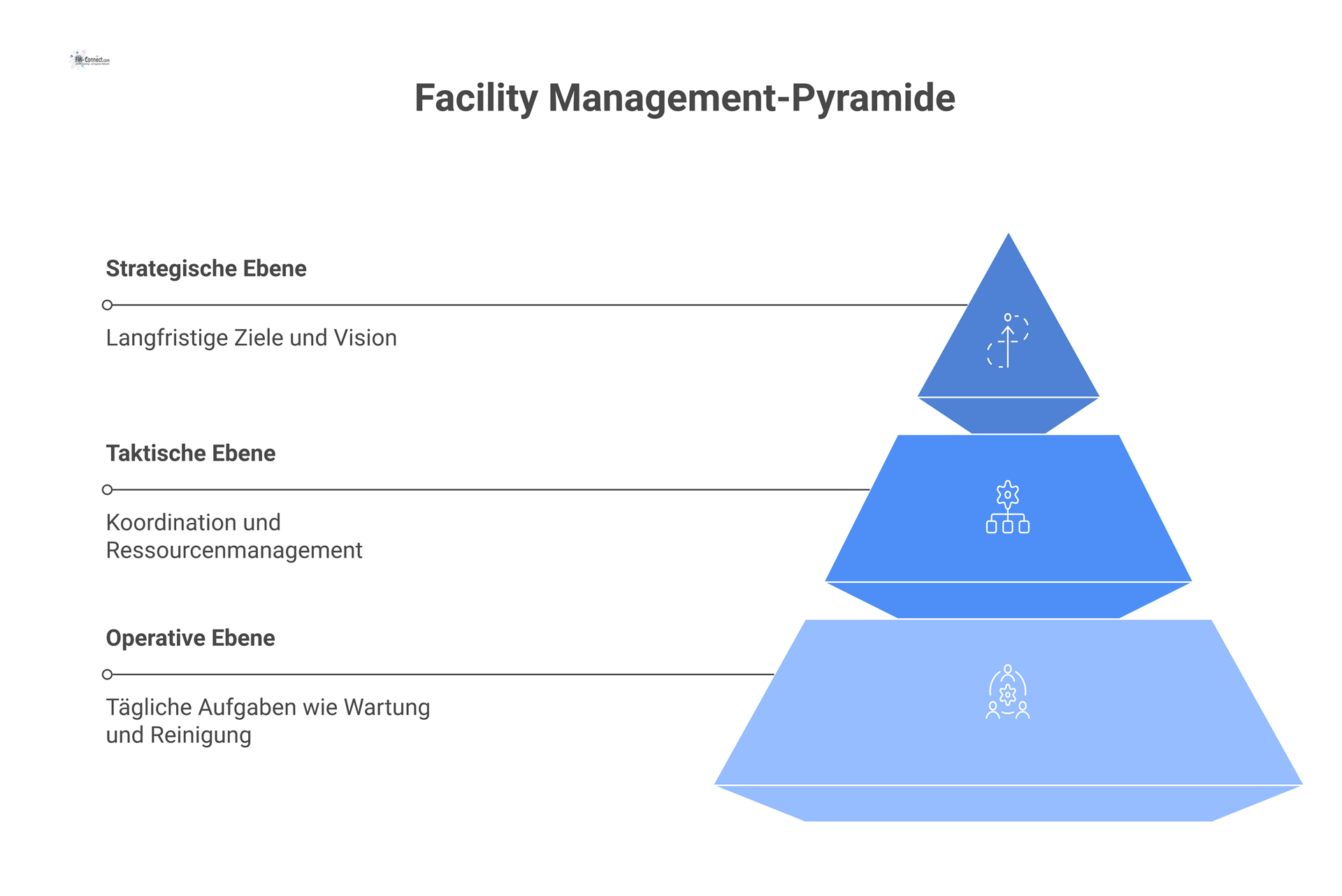 Die operative Ebene im Facility Management fokussiert auf die effektive Realisierung der Strategien und Ziele im Alltagsgeschäft. Ein effizientes Zusammenspiel von strategischer und operativer Ebene stellt sicher, dass die FM-Prozesse reibungslos ablaufen.