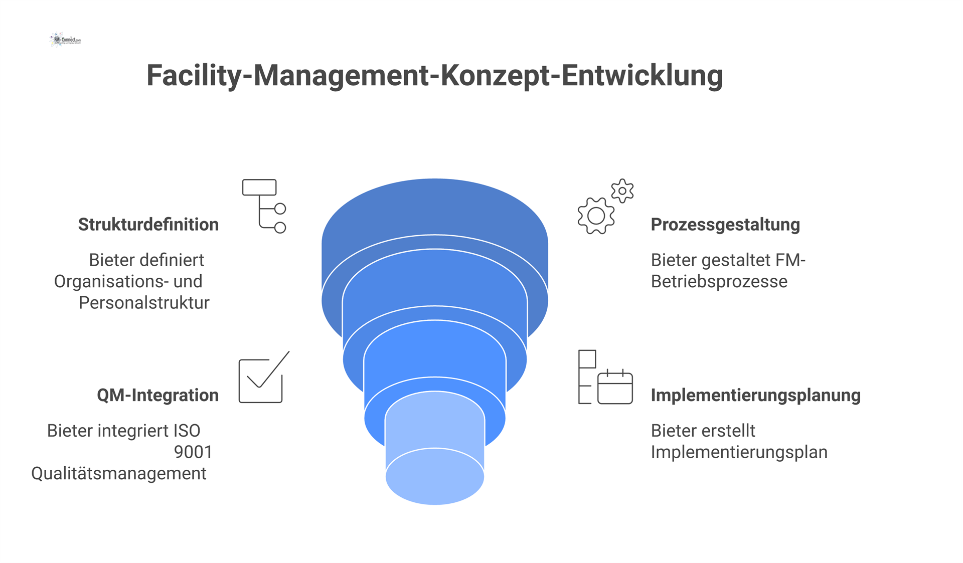 Obwohl es einfach wäre, dem Dienstleister das eigene Konzept als Basis vorzugeben, fehlen in der Praxis solche Konzepte oft. Anders gesagt: Ein umfassendes Konzept entsteht häufig erst, wenn die Leistungen an einen Dritten übertragen werden. Solche Konzepte werden oft während der Ausschreibungsphase von den Bietern entwickelt und dienen als Kriterium für die Vergabe. Diese Vorgehensweise bietet den Vorteil, dass das Know-how des FM-Marktes in das eigene Unternehmen integriert wird.